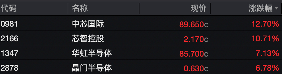 其中,芯片股全线走强,Wind香港半导体指数一度涨超10%。截至收盘,中芯国际收涨12.7%,报89.65港元,续创历史新高。芯智控股收涨10.71%,华虹半导体收涨7.13%,晶门半导体收涨6.78%。