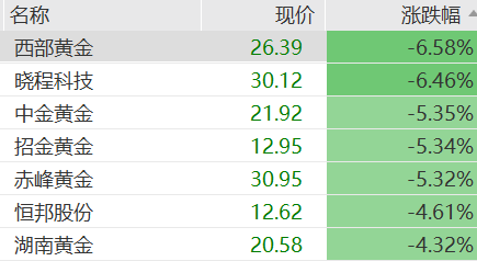 贵金属板块下挫,西部黄金、晓程科技跌超6%,中金黄金、招金黄金跟跌。消息面上,国际金银价格同步下探,现货白银短线跳水,跌幅超2%;现货黄金跌约0.4%,纽约期金失守4310美元/盎司。