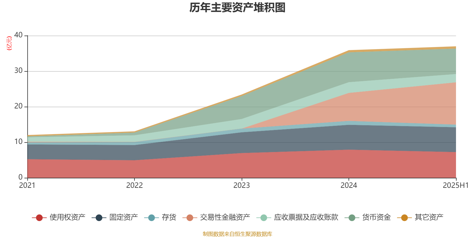 资产重大变化方面,截至2025年上半年,公司交易性金融资产较上期末增加51.04%,占公司总资产比重上升10.25个百分点;货币资金较上期末减少14.9%,占公司总资产比重下降4.07个百分点;使用权资产较上期末减少8.65%,占公司总资产比重下降2.49个百分点;应收票据及应收账款较上期末减少22.52%,占公司总资产比重下降2.08个百分点。