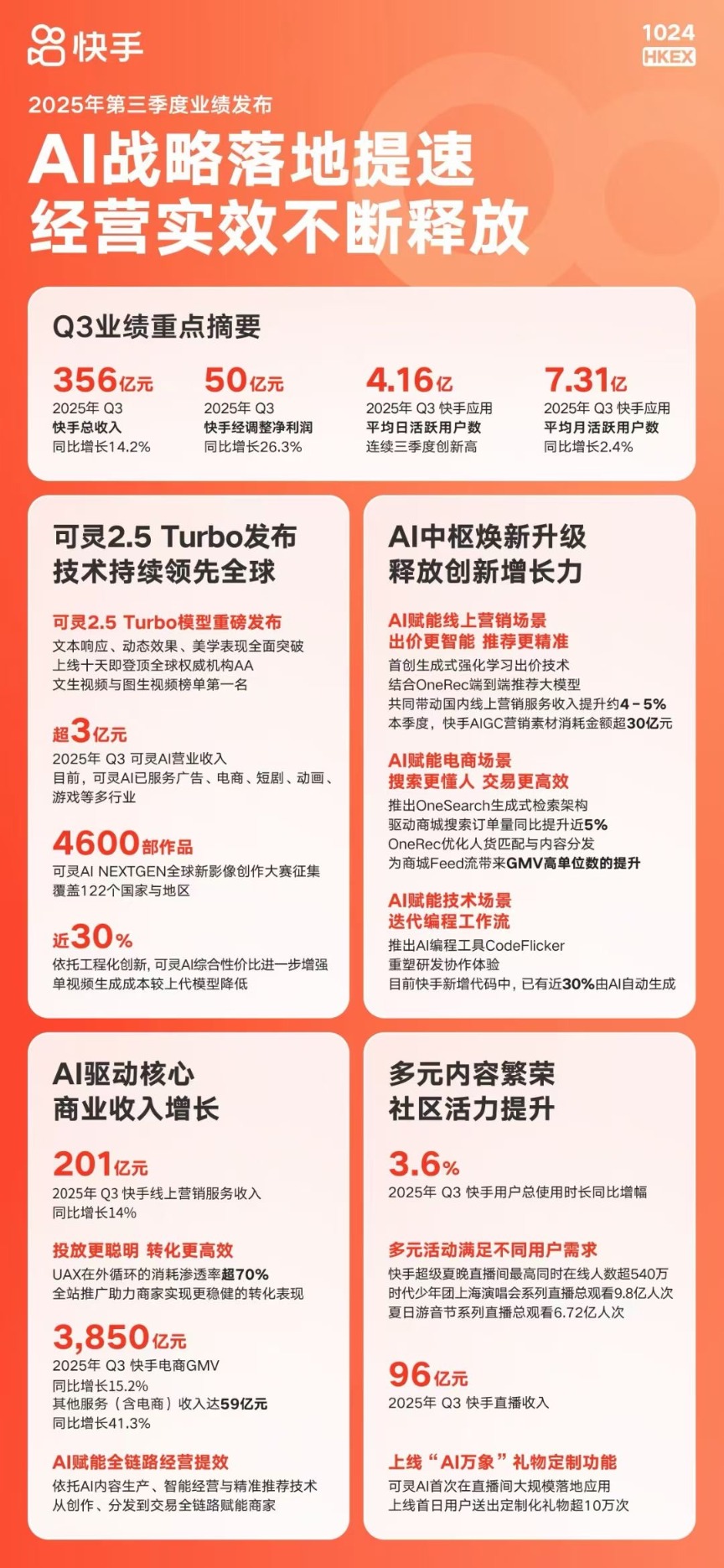 财报显示,公司第三季度单季总收入达356亿元,同比增长14.2%;经调整净利润50亿元,同比增长26.3%。值得关注的是,其自研大模型“可灵”在文生视频领域登顶全球榜单,AI技术正从成本中心转化为收入增长的核心驱动力。