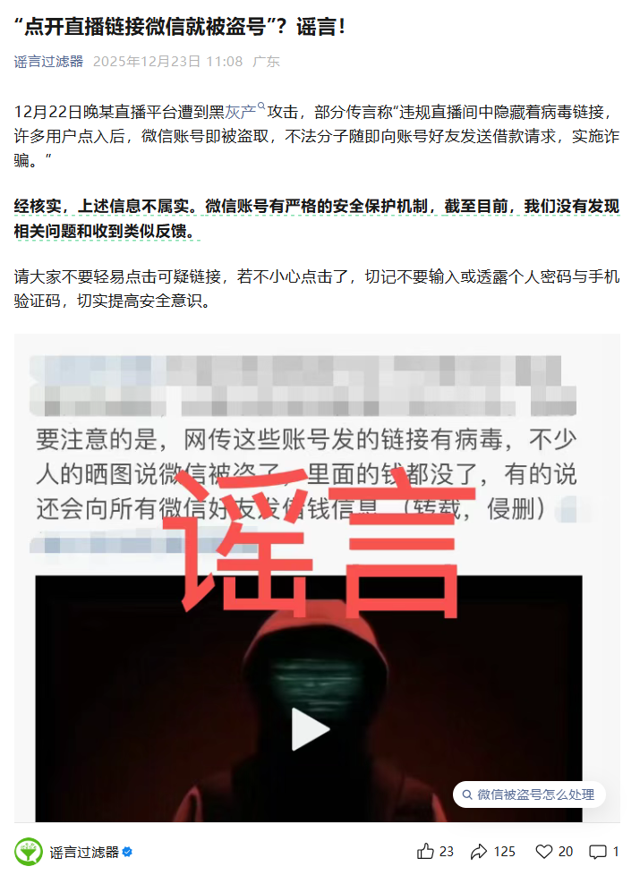 对此,12月23日微信官方辟谣平台“谣言过滤器”在公众号发文称,上述信息不属实。微信账号有严格的安全保护机制,截至目前,没有发现相关问题和收到类似反馈。