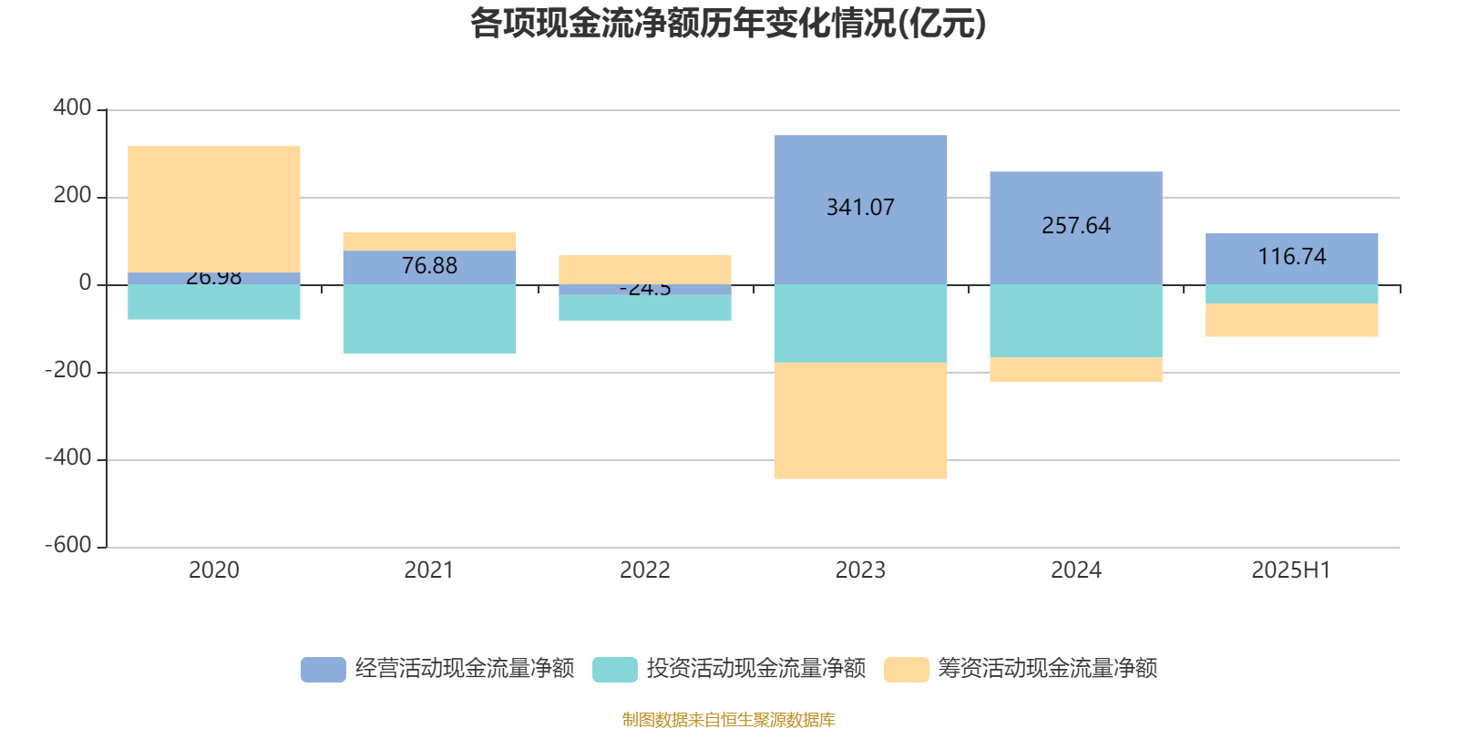 2025年上半年,公司经营活动现金流净额为116.74亿元;筹资活动现金流净额-75.56亿元;投资活动现金流净额-44.06亿元。