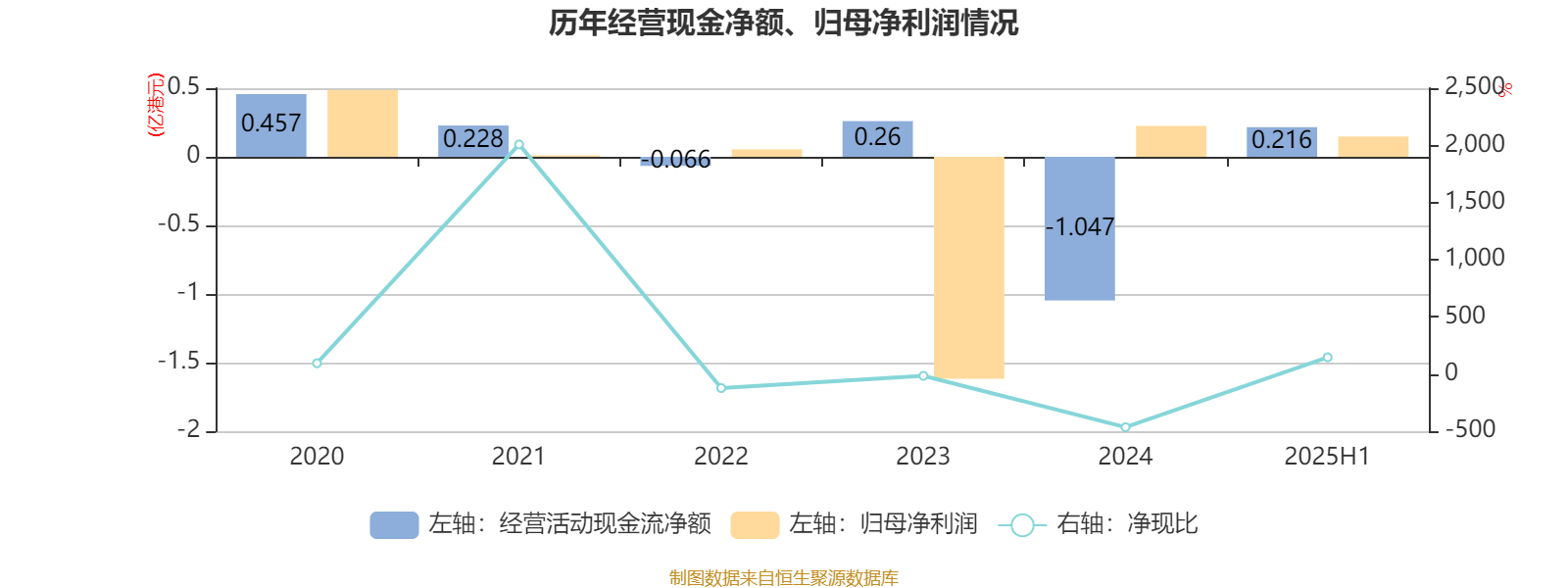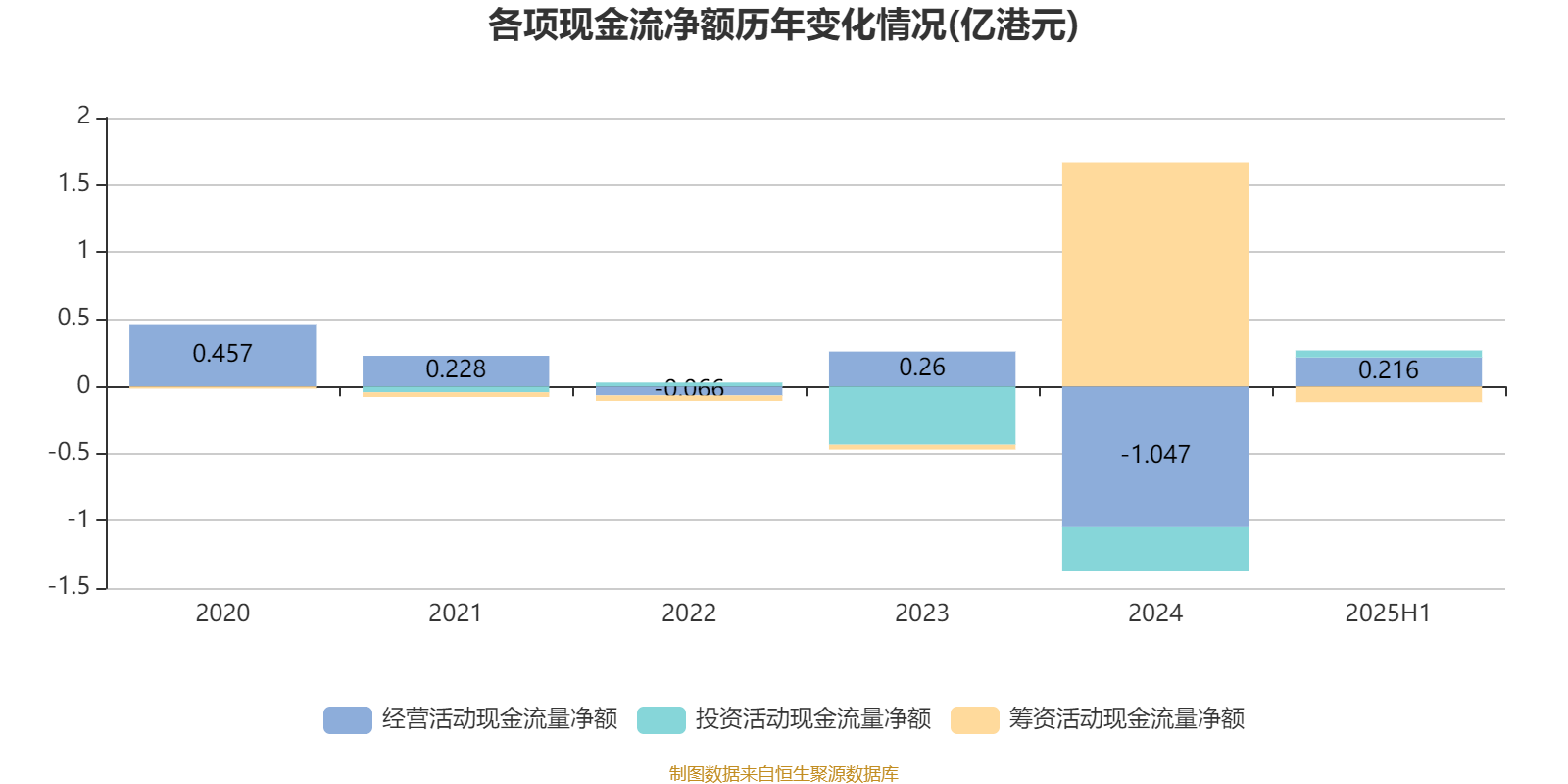2025年上半年,公司经营活动现金流净额为2163.1万港元;筹资活动现金流净额-1155.6万港元;投资活动现金流净额522.3万港元。