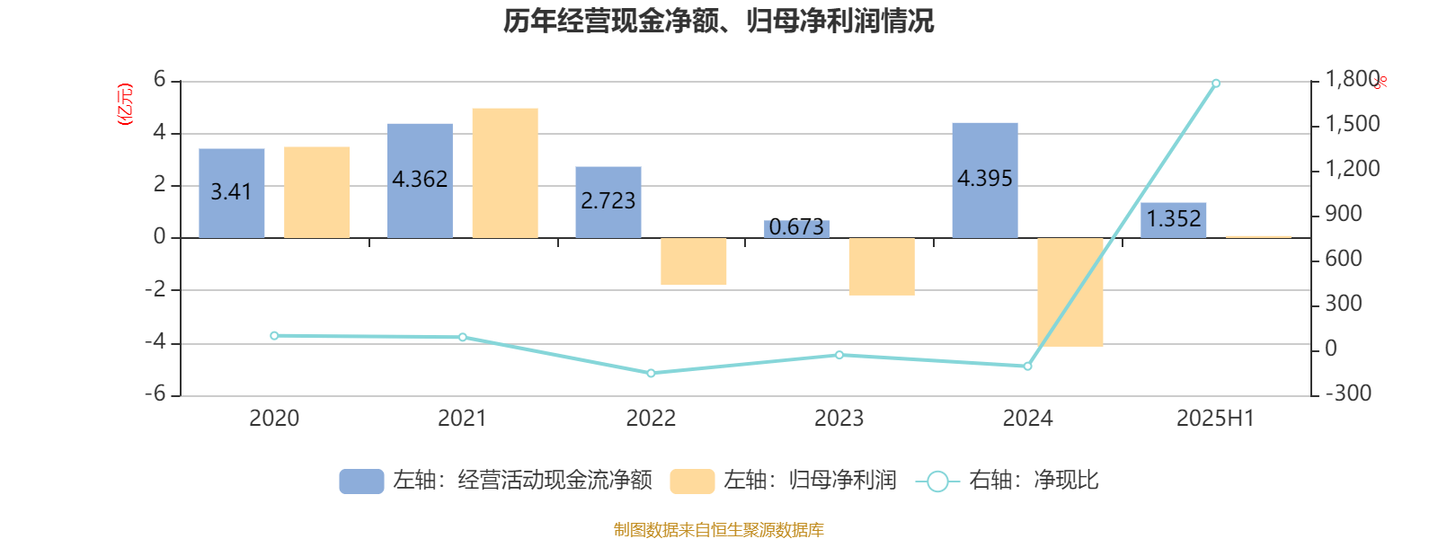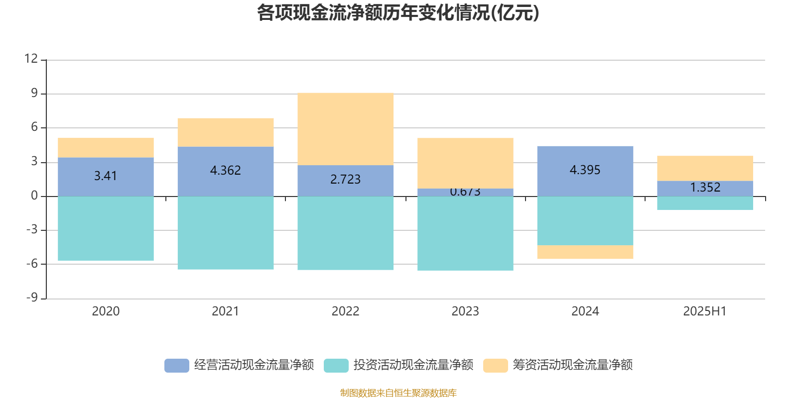 2025年上半年,公司经营活动现金流净额为1.35亿元;筹资活动现金流净额2.2亿元;投资活动现金流净额-1.21亿元。