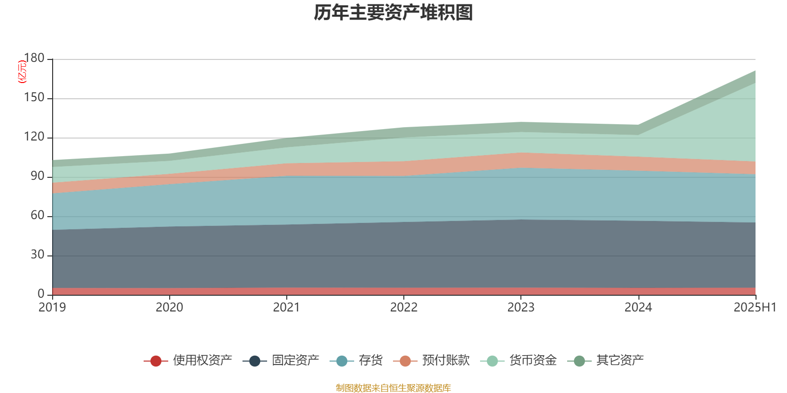 资产重大变化方面,截至2025年上半年,公司货币资金较上期末增加264.65%,占公司总资产比重上升22.37个百分点;固定资产较上期末减少2.81%,占公司总资产比重下降10.4个百分点;存货较上期末减少3.61%,占公司总资产比重下降7.94个百分点;预付账款较上期末减少9.52%,占公司总资产比重下降2.61个百分点。