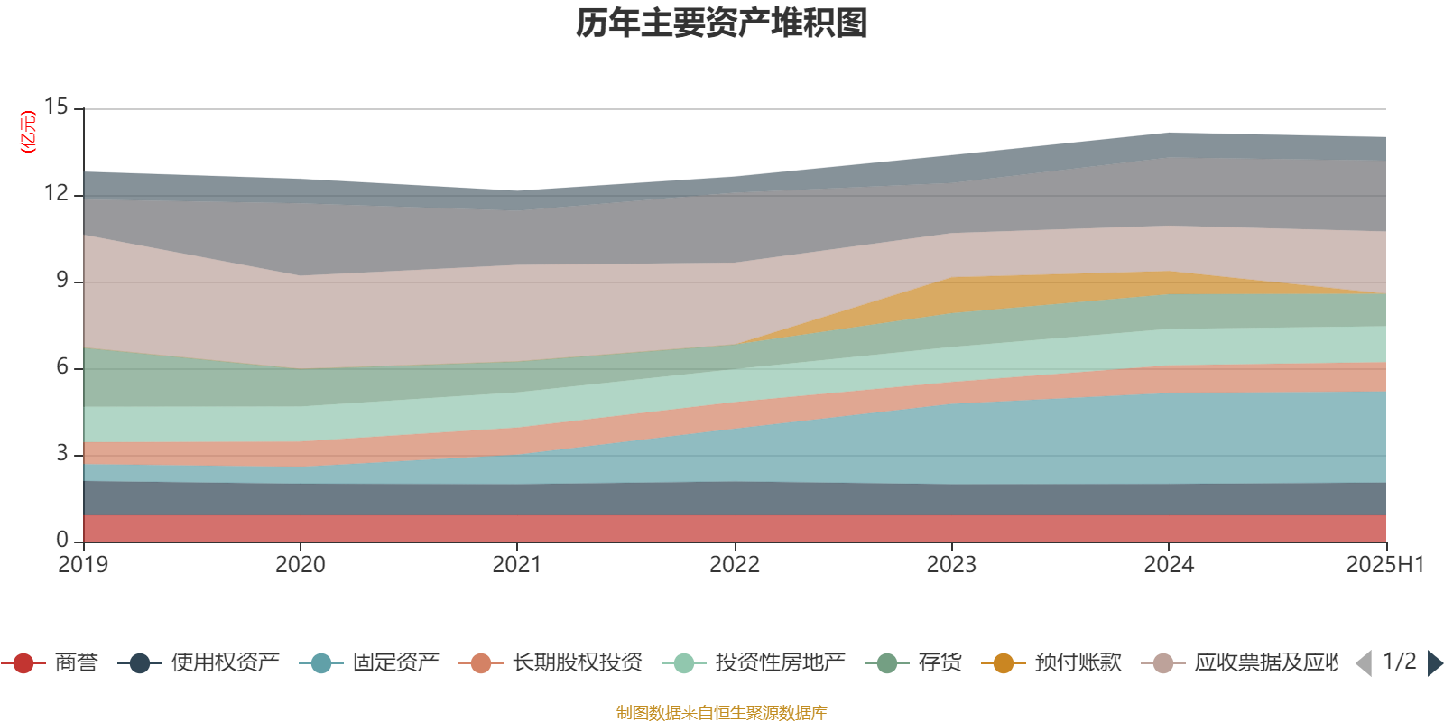 资产重大变化方面,截至2025年上半年,公司预付账款较上期末减少100%,占公司总资产比重下降5.67个百分点;应收票据及应收账款较上期末增加36.71%,占公司总资产比重上升4.26个百分点;货币资金较上期末增加4.06%,占公司总资产比重上升0.87个百分点;长期股权投资较上期末增加6.03%,占公司总资产比重上升0.49个百分点。