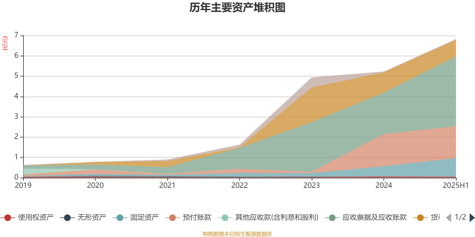 资产重大变化方面,截至2025年上半年,公司应收票据及应收账款较上期末增加69.21%,占公司总资产比重上升11.46个百分点;货币资金较上期末减少19.57%,占公司总资产比重下降7.39个百分点;预付账款较上期末减少0.96%,占公司总资产比重下降7.36个百分点;固定资产较上期末增加85.5%,占公司总资产比重上升3.94个百分点。