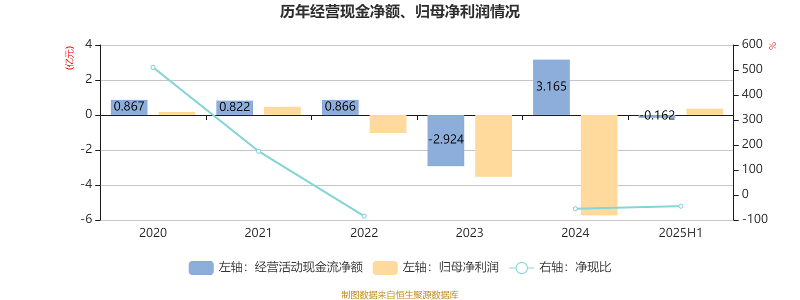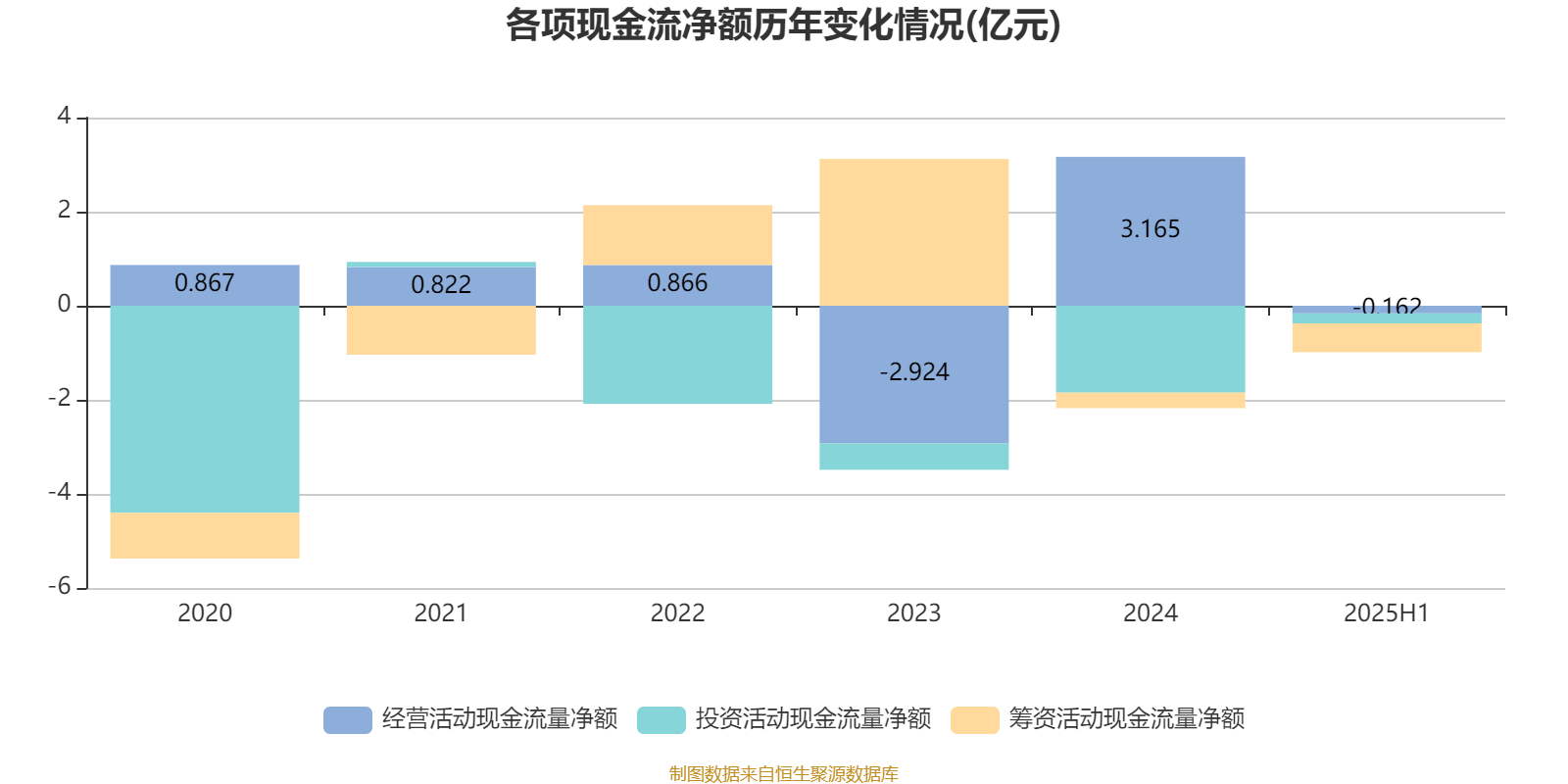 2025年上半年,公司经营活动现金流净额为-1618.9万元;筹资活动现金流净额-6107.3万元;投资活动现金流净额-2138.7万元。