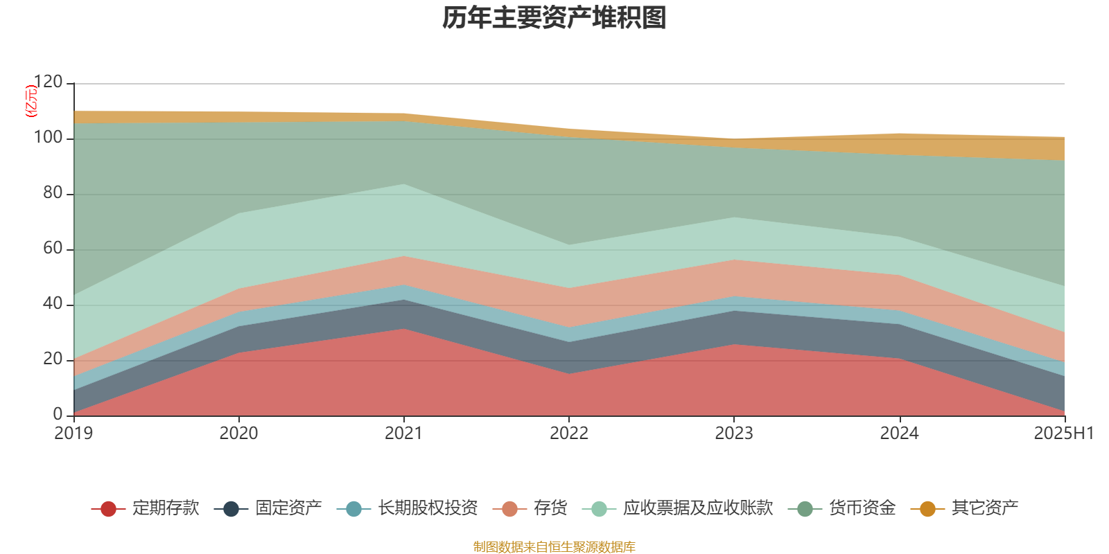 资产重大变化方面,截至2025年上半年,公司定期存款较上期末减少92.6%,占公司总资产比重下降18.69个百分点;货币资金较上期末增加53.6%,占公司总资产比重上升16.15个百分点;应收票据及应收账款较上期末增加19.96%,占公司总资产比重上升2.93个百分点;存货较上期末减少14.45%,占公司总资产比重下降1.67个百分点。