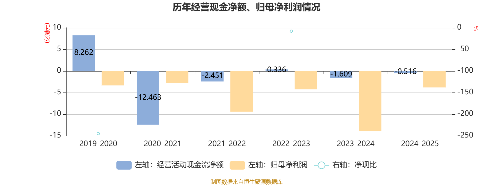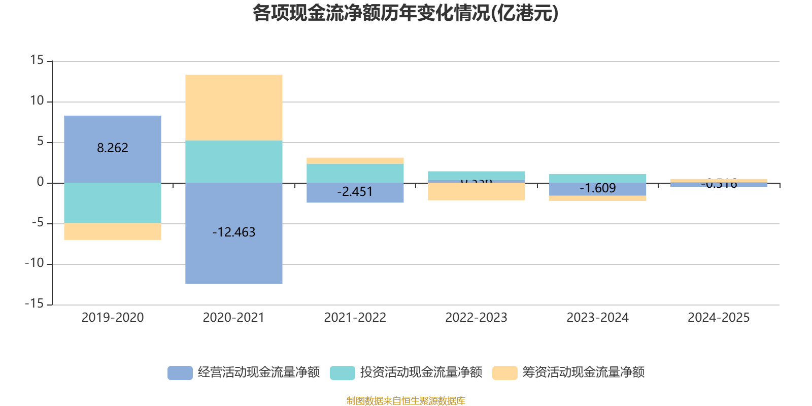 报告期内,公司经营活动现金流净额为-5163.6万港元,同比增加1.09亿港元;筹资活动现金流净额3908.2万港元,同比增加1.03亿港元;投资活动现金流净额664.1万港元,上年同期为1.07亿港元。