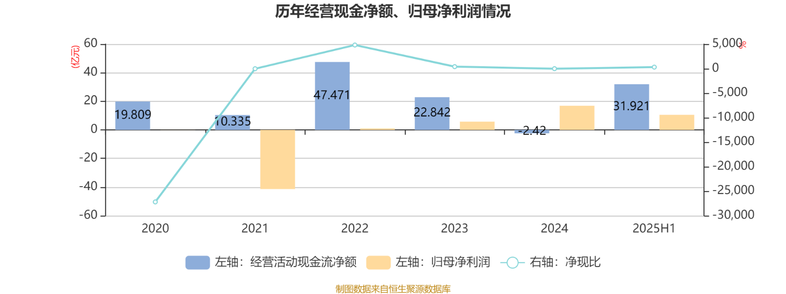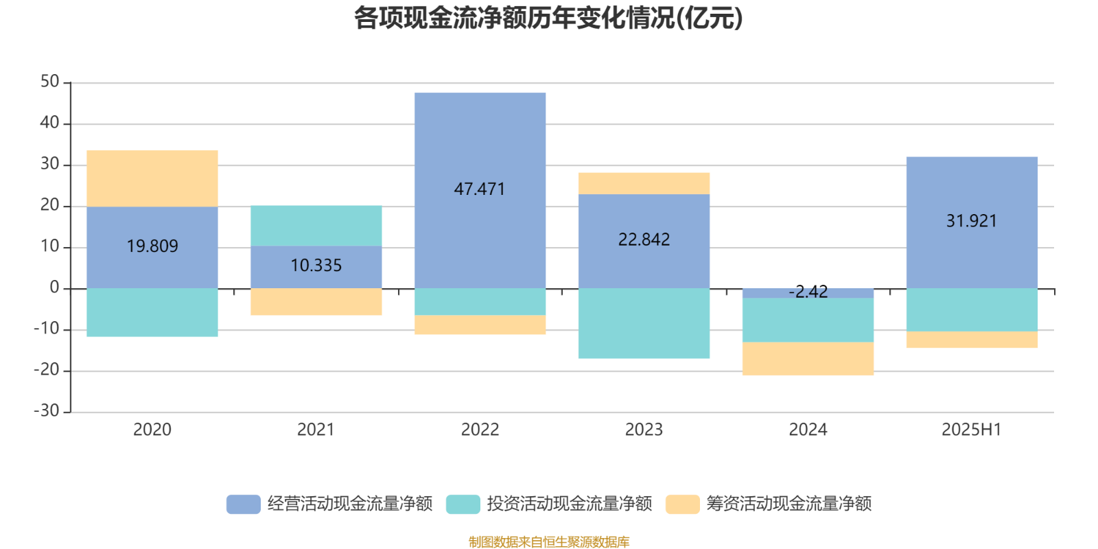 2025年上半年,公司经营活动现金流净额为31.92亿元;筹资活动现金流净额-3.99亿元;投资活动现金流净额-10.51亿元。