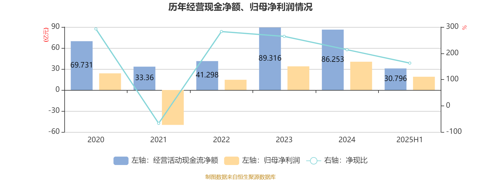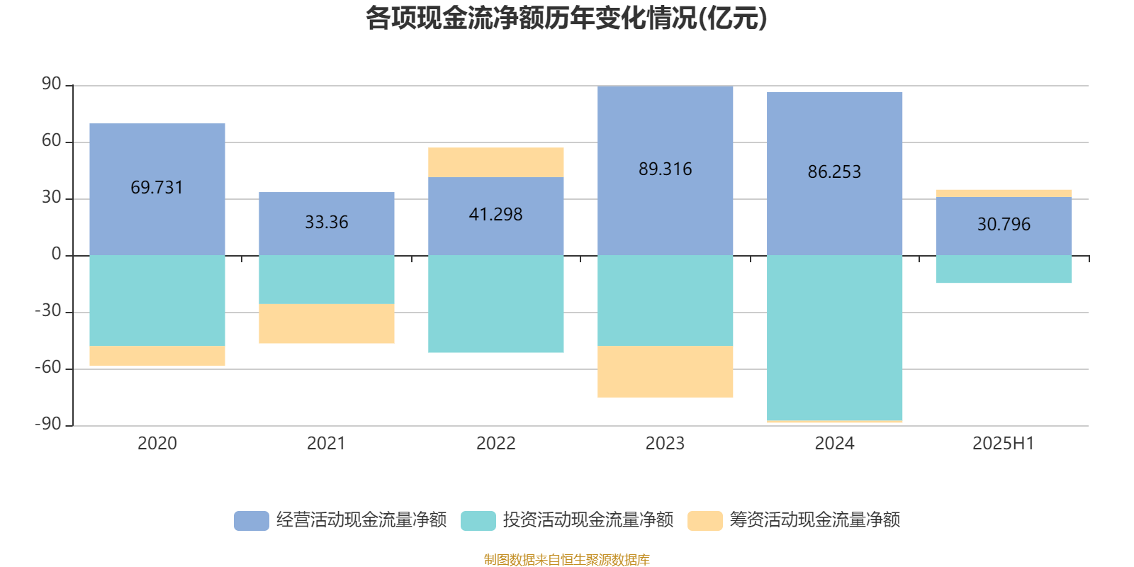 2025年上半年,公司经营活动现金流净额为30.8亿元;筹资活动现金流净额3.81亿元;投资活动现金流净额-14.69亿元。