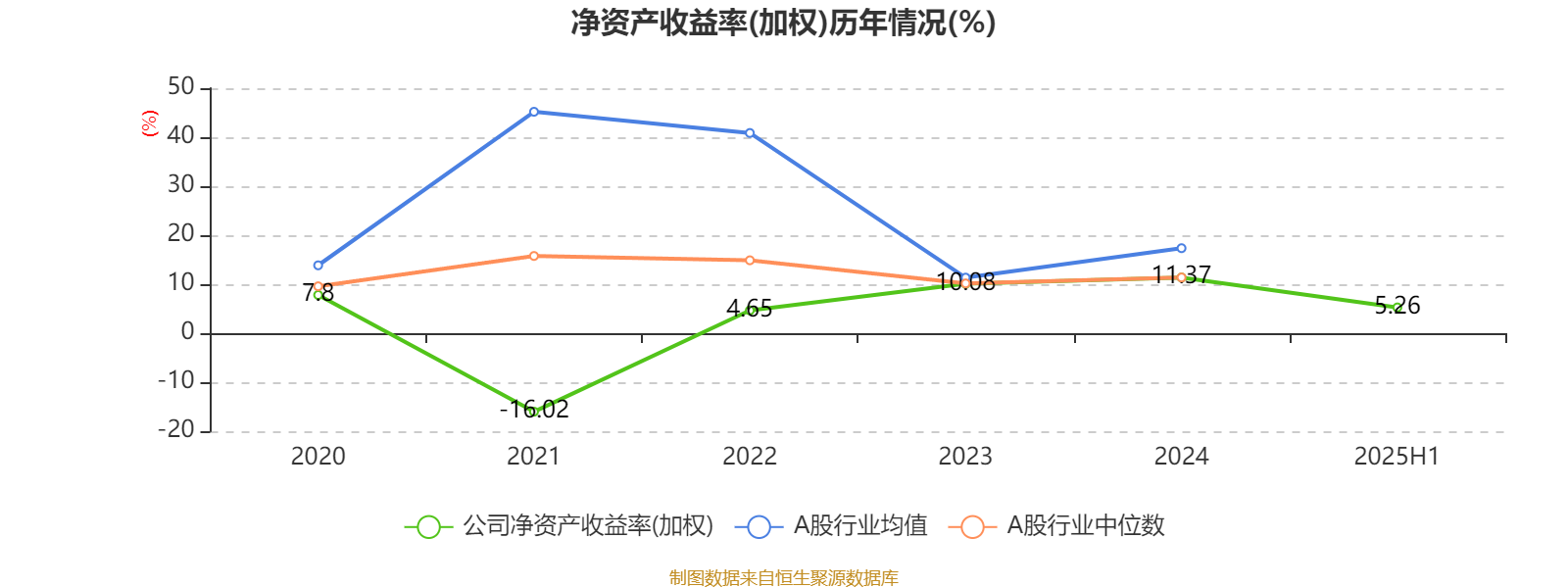 2025年上半年,公司平均净资产收益率为5.26%,较上年同期下降2.25个百分点。