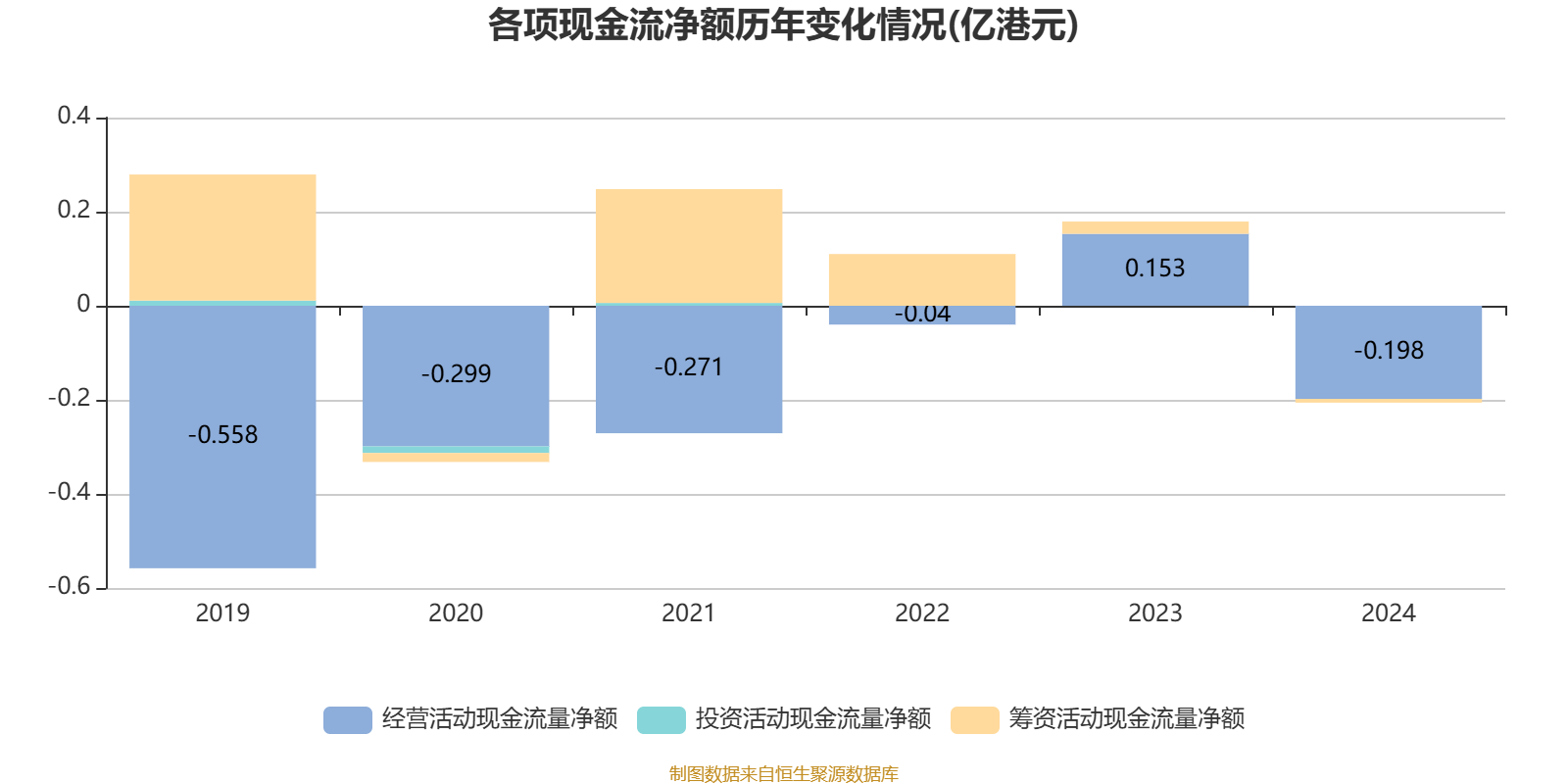 2024年,公司经营活动现金流净额为-1983.9万港元,同比减少3513.5万港元;筹资活动现金流净额-80.5万港元,同比减少340.7万港元;投资活动现金流净额8000港元,上年同期为1.7万港元。