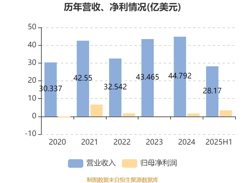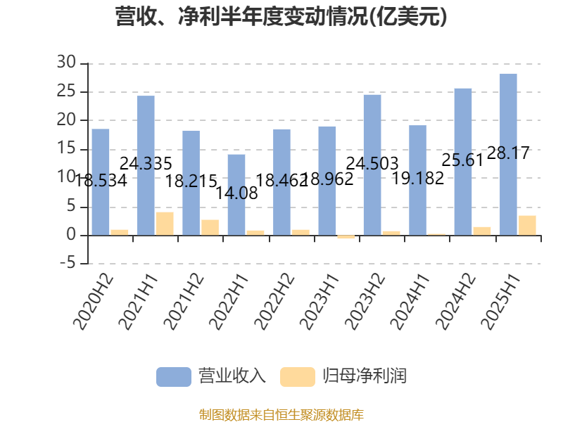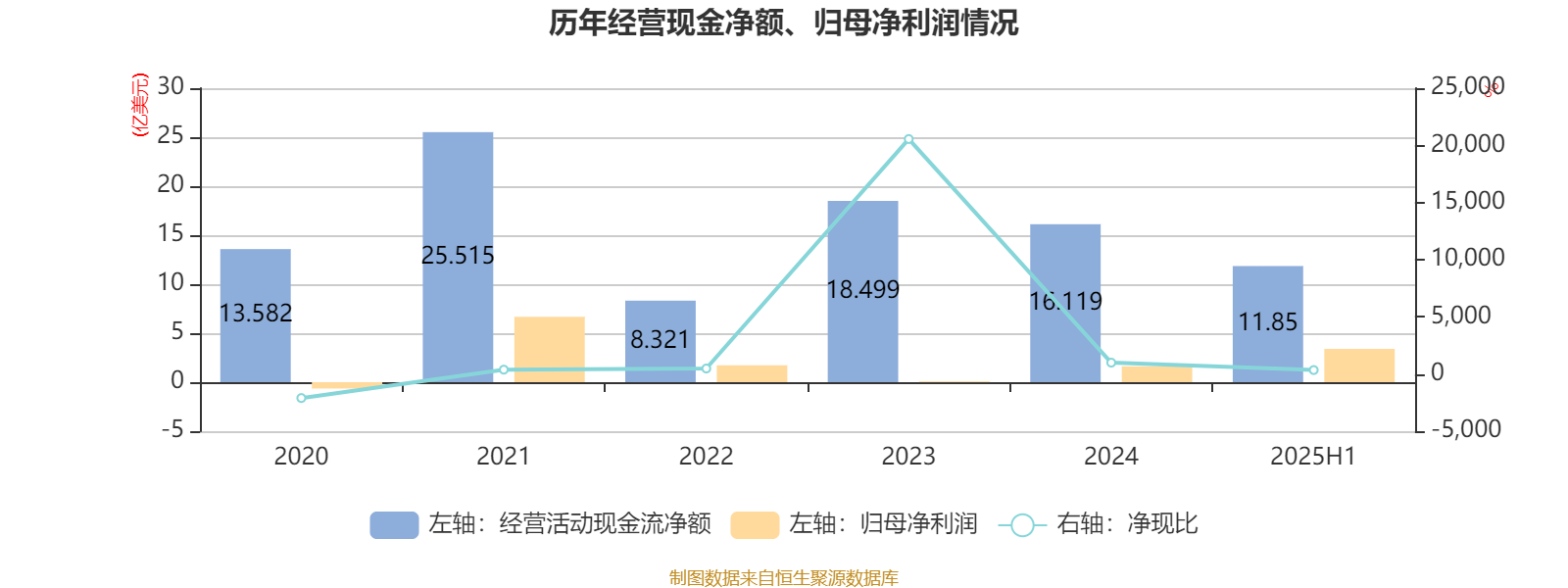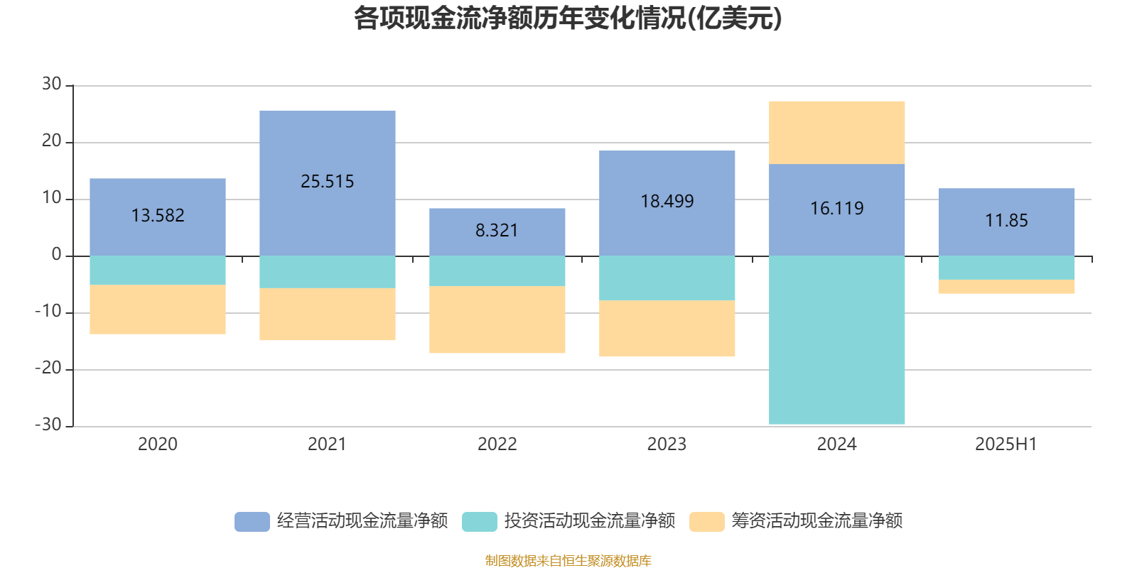 2025年上半年,公司经营活动现金流净额为11.85亿美元;筹资活动现金流净额-2.46亿美元;投资活动现金流净额-4.24亿美元。