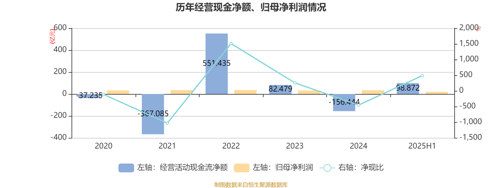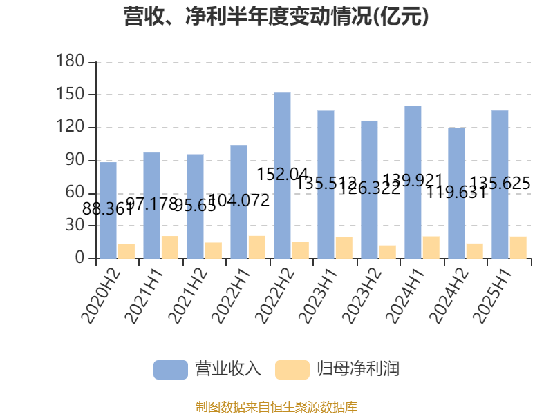 2025年上半年,公司经营活动现金流净额为98.87亿元;筹资活动现金流净额36.01亿元;投资活动现金流净额-12.29亿元。
