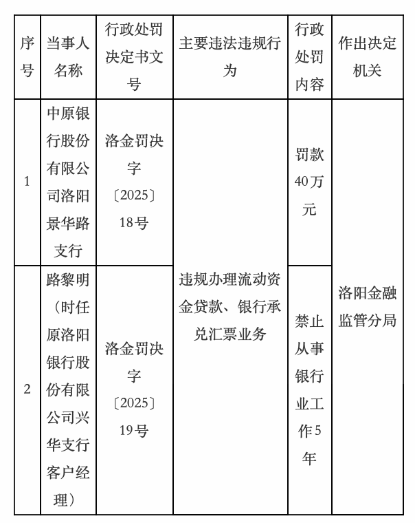 同时,时任原洛阳银行股份有限公司兴华支行客户经理路黎明,被禁止从事银行业工作5年。
