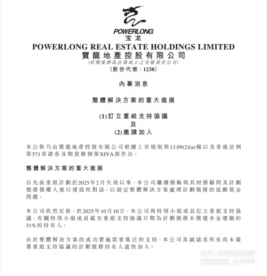近日,宝龙地产、宝龙商业发布债务重组进展公告,披露关键协议的落地情况。据透露,10月10日,宝龙地产与持有31%计划债务的债权人特别小组订立了重组支持协议。这标志着首次重组失败后,宝龙地产境外债二次重组取得关键突破,为缓解公司流动性危机中注入一丝生机。