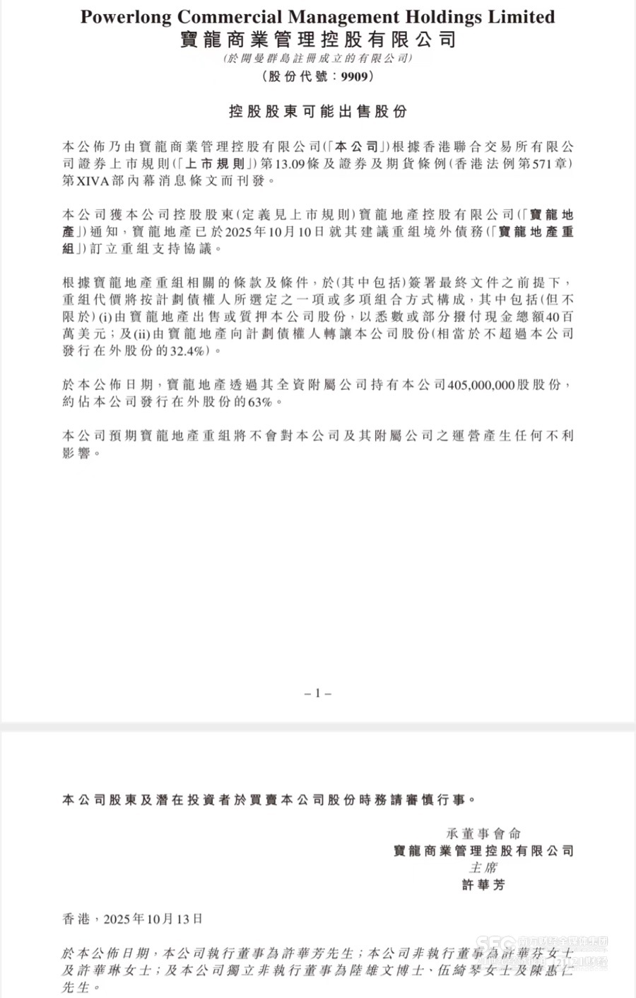 在宝龙地产(01238.HK)境外债的二次重组中,实控人许氏家族仍在力保对宝龙商业(09909.HK)的控股权。