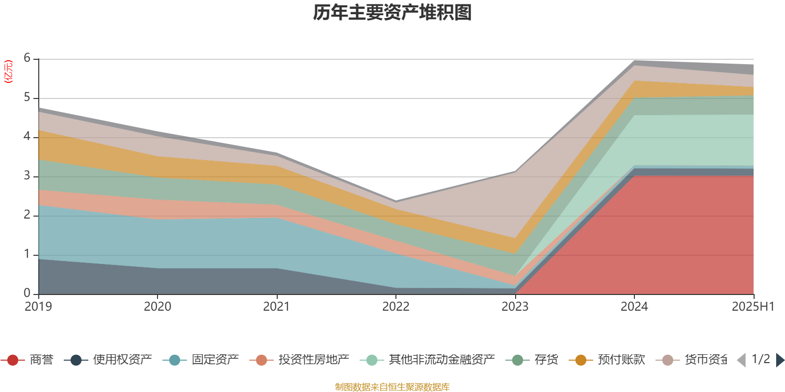 资产重大变化方面,截至2025年上半年,公司预付账款较上期末减少51.11%,占公司总资产比重下降3.67个百分点;应收票据及应收账款较上期末增加152.34%,占公司总资产比重上升2.21个百分点;货币资金较上期末减少19.04%,占公司总资产比重下降1.13个百分点;商誉较上期末没有变化,占公司总资产比重上升0.95个百分点。