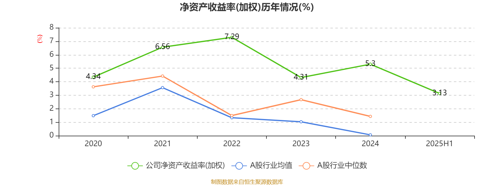 2025年上半年,公司平均净资产收益率为3.13%,较上年同期上升0.4个百分点。