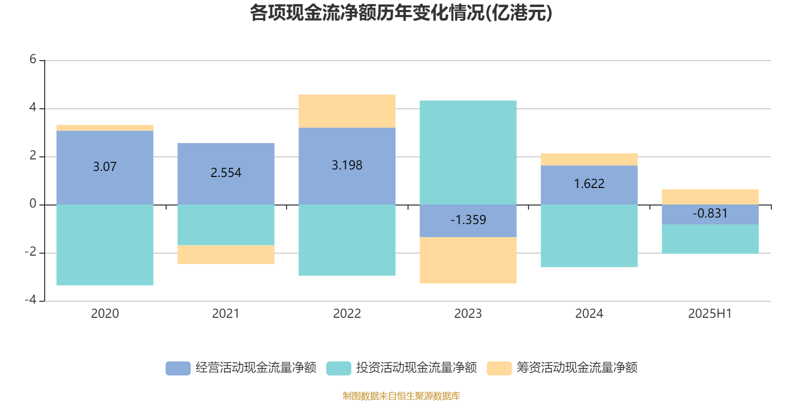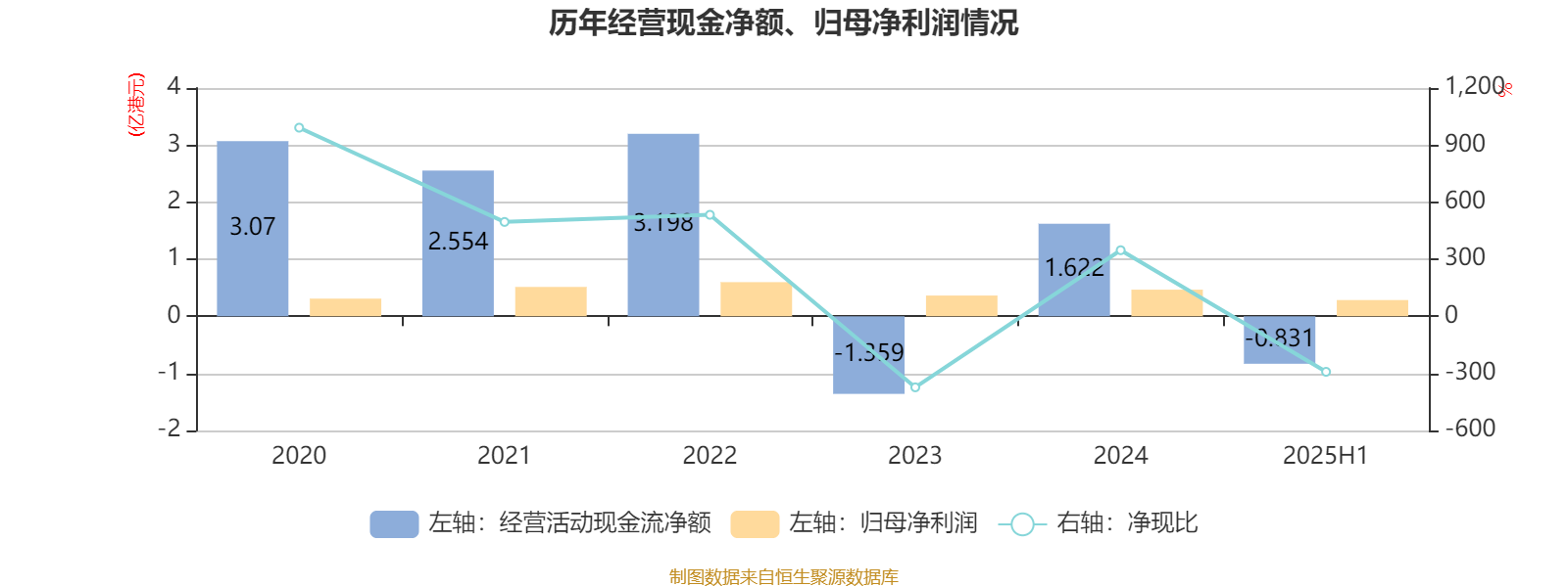 2025年上半年,公司经营活动现金流净额为-8313.7万港元;筹资活动现金流净额6360.7万港元;投资活动现金流净额-1.22亿港元。