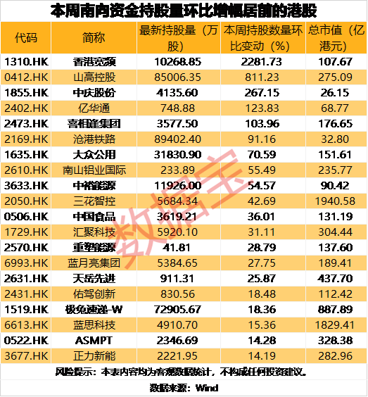 从港股通持股占港股总股数比例来看,本周港股通环比增幅超过10%的个股中,大众公用、沧港铁路、亿华通最新持股比例居前,分别达到59.64%、22.34%、20.87%。