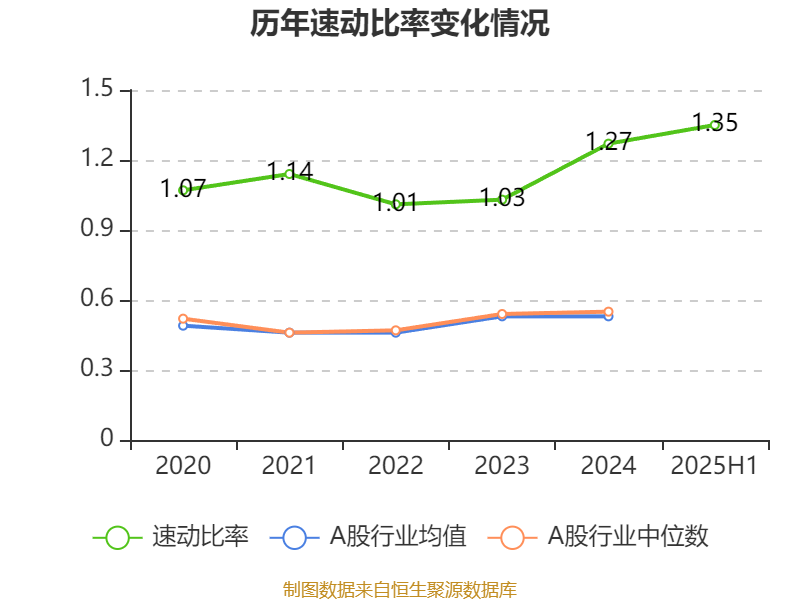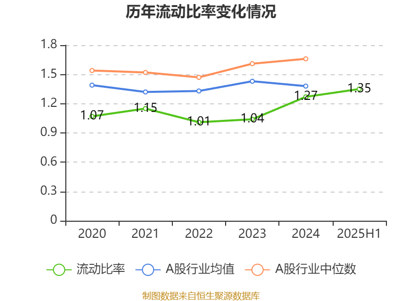 2025年上半年,公司流动比率为1.35,速动比率为1.35。