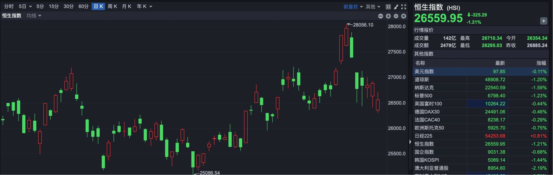 截至收盘,恒生指数报26559.95点,下跌325.29点,跌幅1.21%。