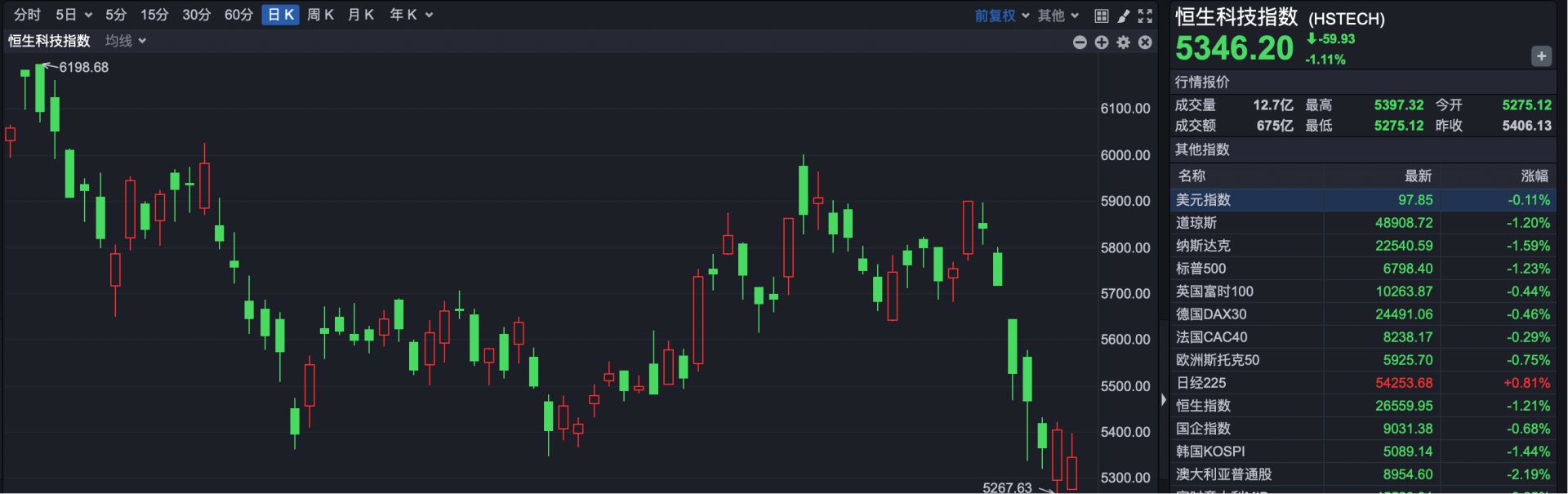 恒生科技指数收盘报5346.20点,下跌59.93点,跌幅1.11%。