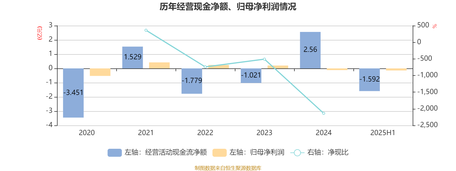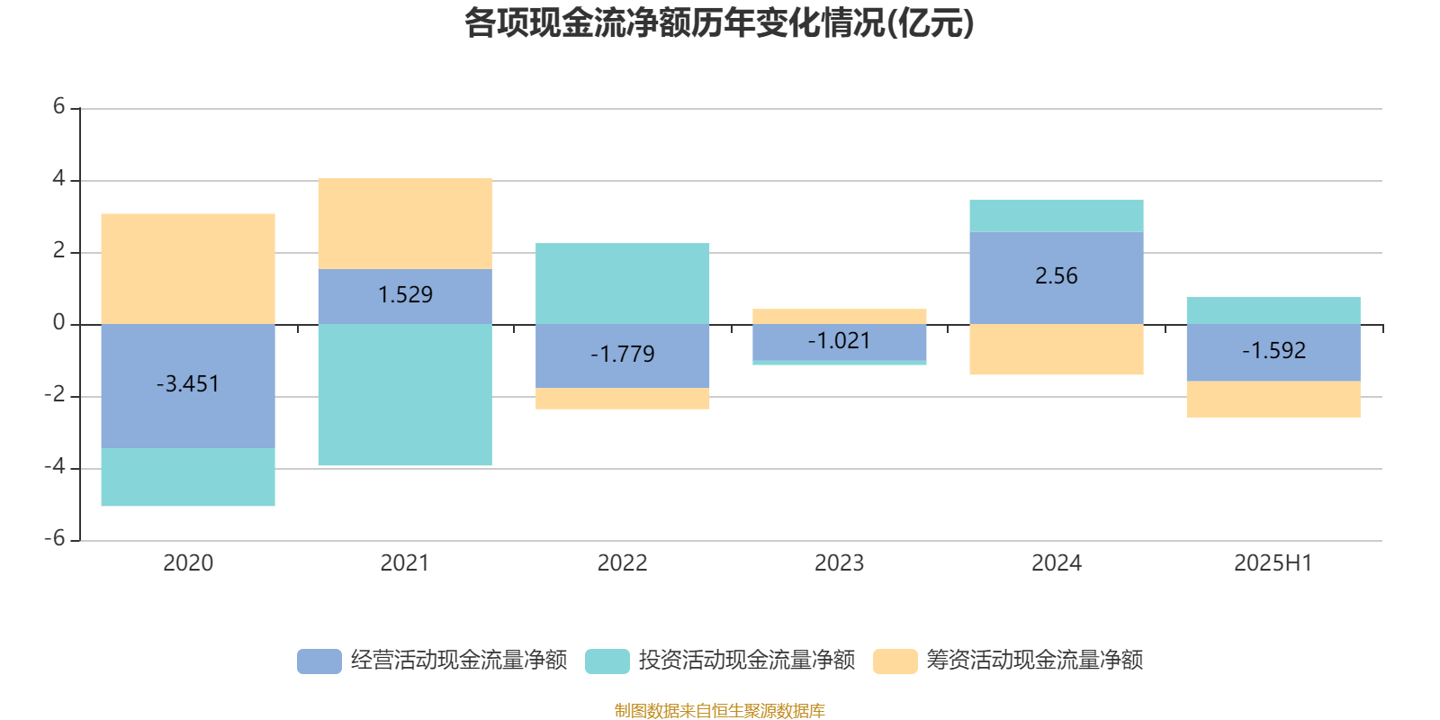 2025年上半年,公司经营活动现金流净额为-1.59亿元;筹资活动现金流净额-1.01亿元;投资活动现金流净额7509万元。