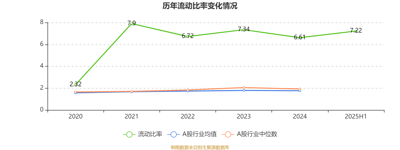 2025年上半年,公司流动比率为7.22。