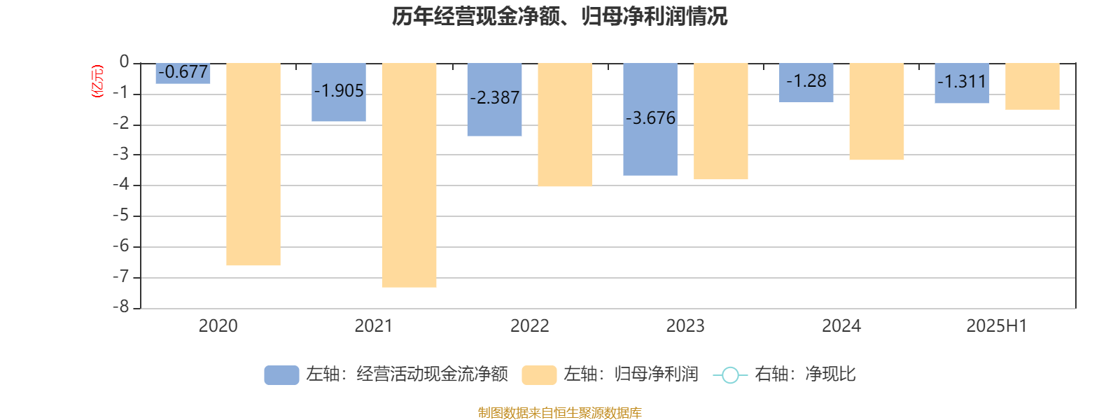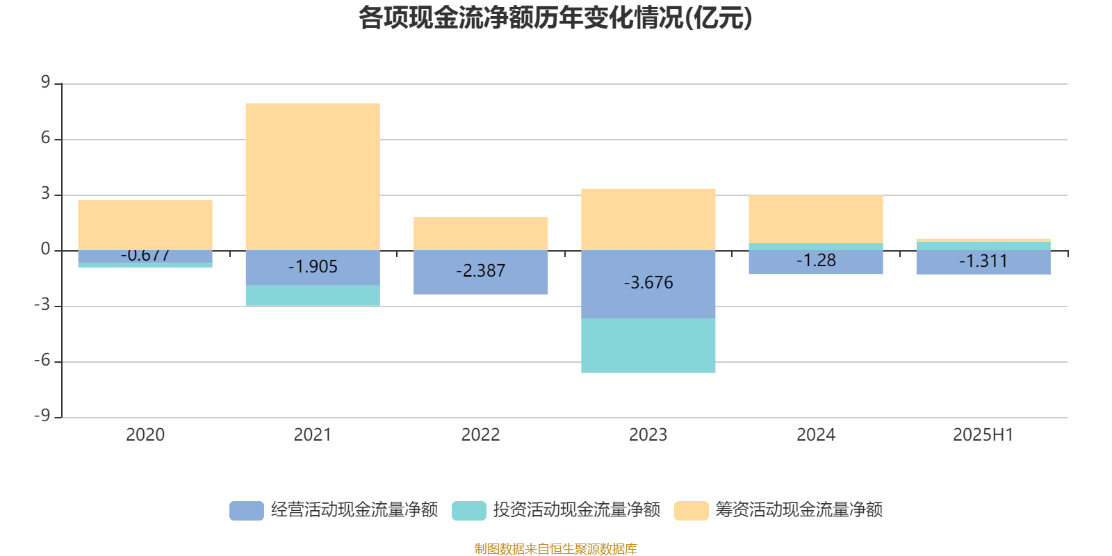2025年上半年,公司经营活动现金流净额为-1.31亿元;筹资活动现金流净额1606.4万元;投资活动现金流净额4520.1万元。