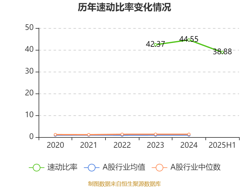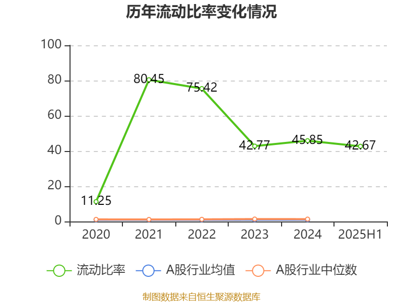 2025年上半年,公司流动比率为42.67,速动比率为38.88。
