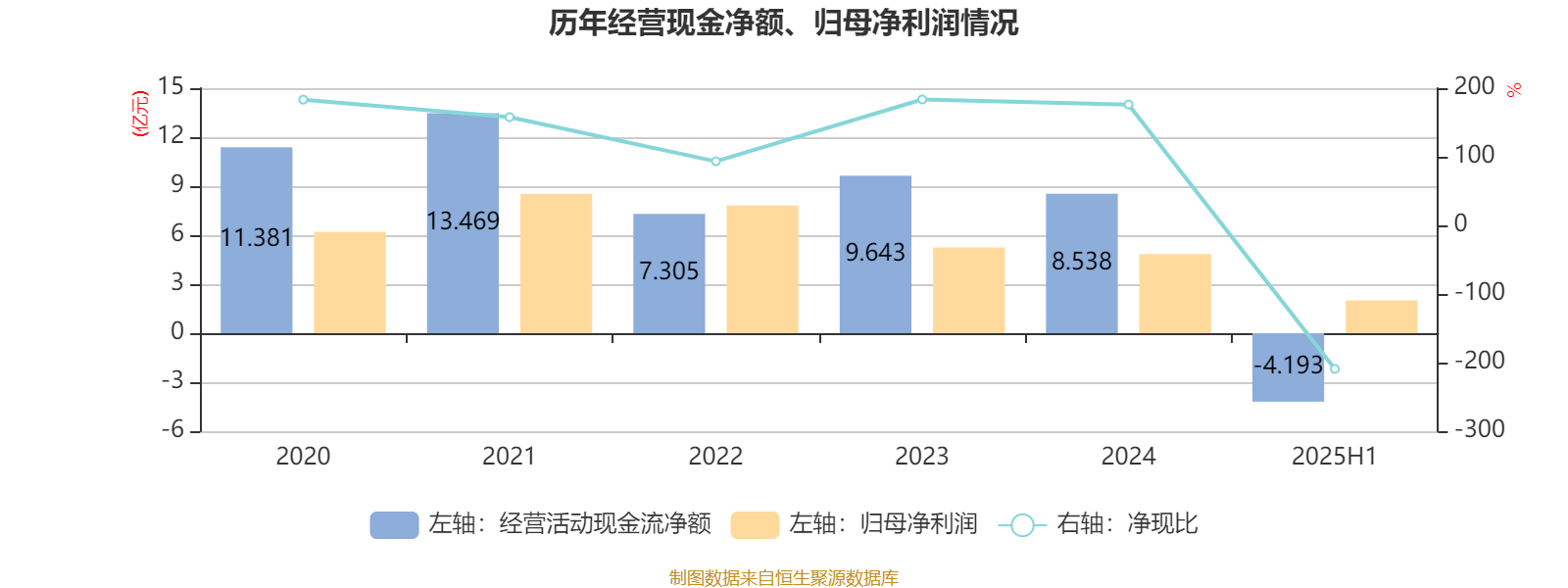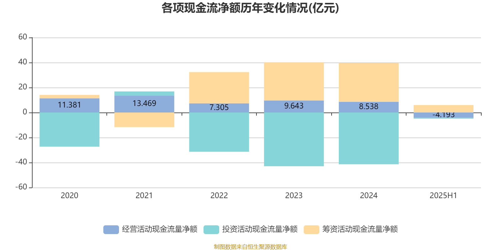 2025年上半年,公司经营活动现金流净额为-4.19亿元;筹资活动现金流净额5.95亿元;投资活动现金流净额-7187.2万元。