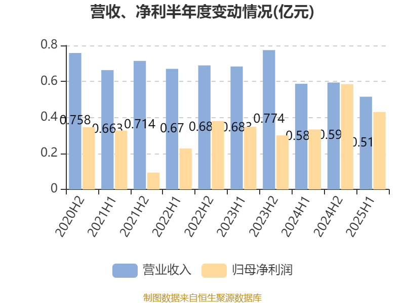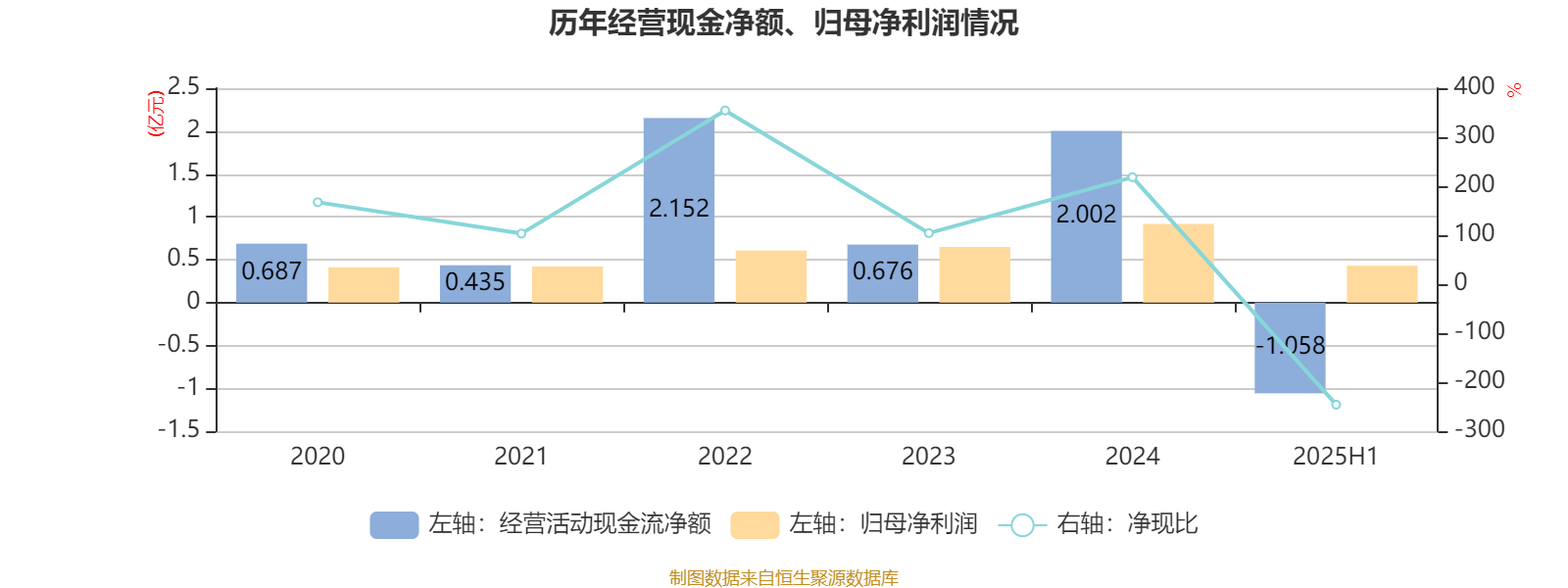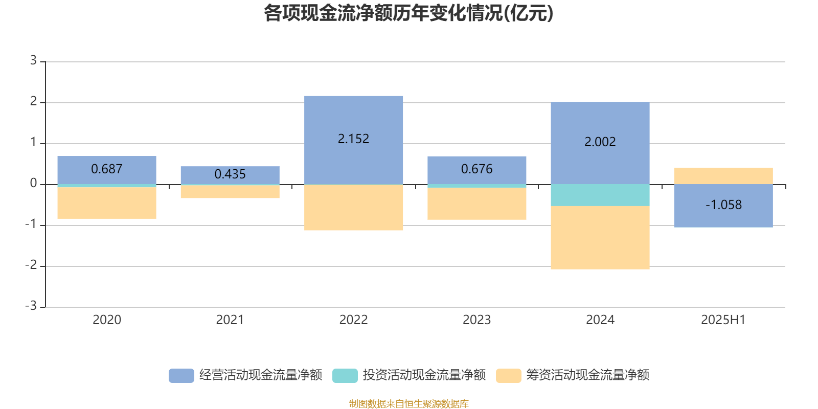 2025年上半年,公司经营活动现金流净额为-1.06亿元;筹资活动现金流净额3958.22万元;投资活动现金流净额-44.34万元。