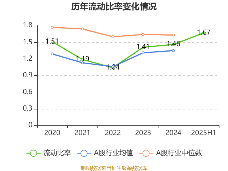 2025年上半年,公司流动比率为1.67,速动比率为1.65。