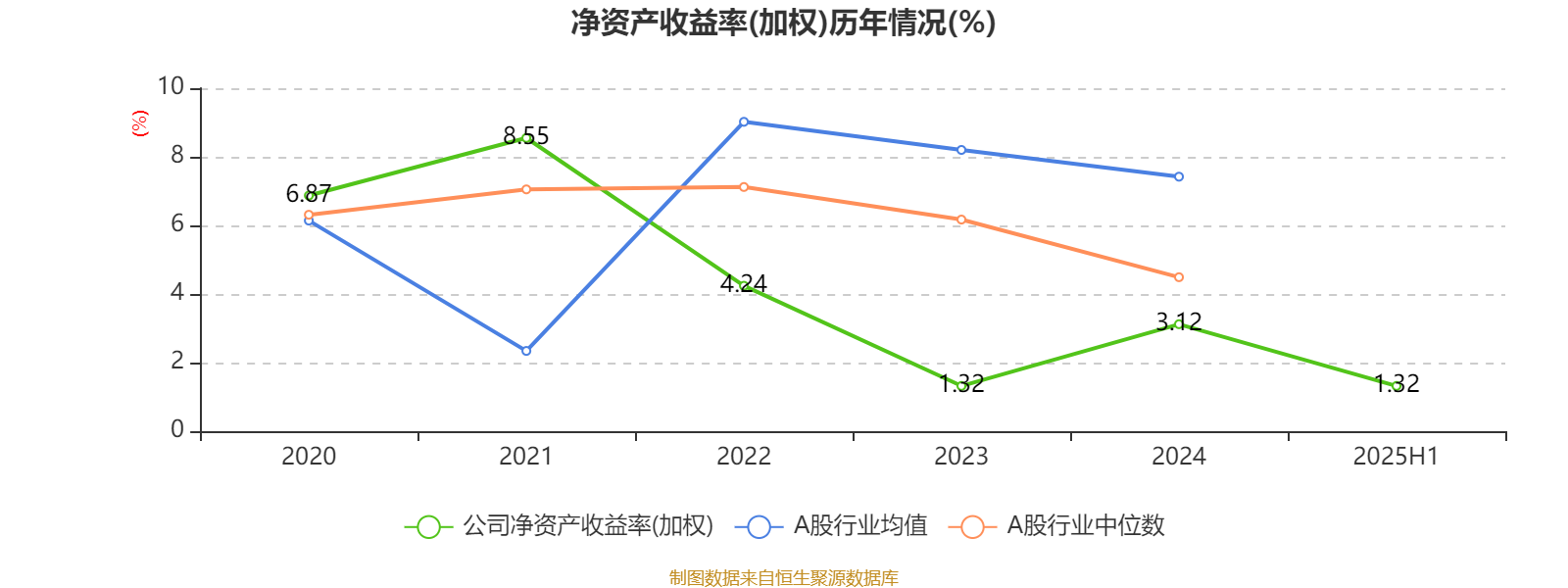 2025年上半年,公司平均净资产收益率为1.32%,较上年同期上升0.44个百分点。