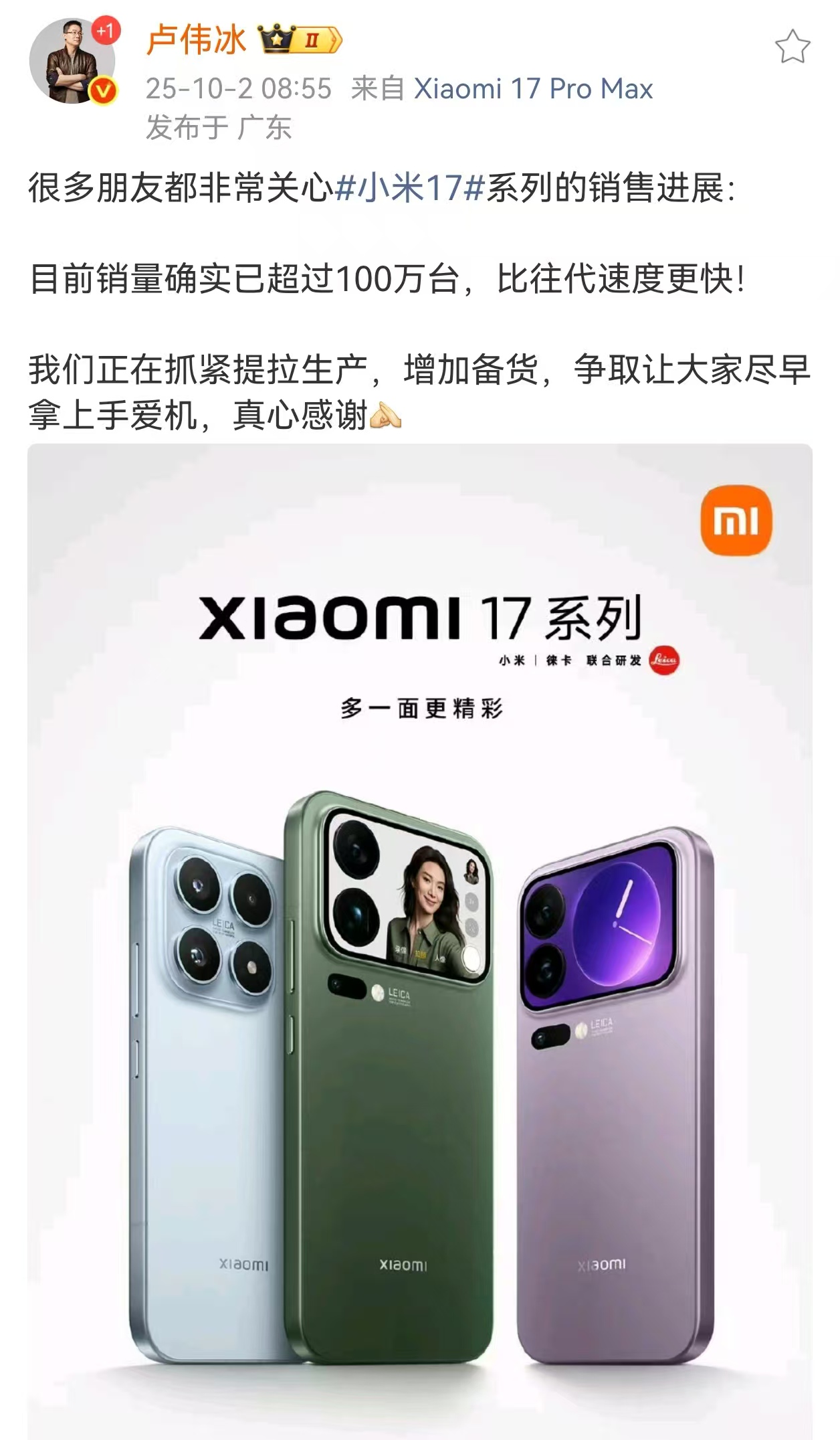 小米集团卢伟冰:小米17系列销量已超100万台 正在抓紧提拉生产
