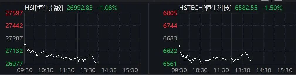 恒生指数盘中跌超1%,恒生科技指数一度跌超1.7%。