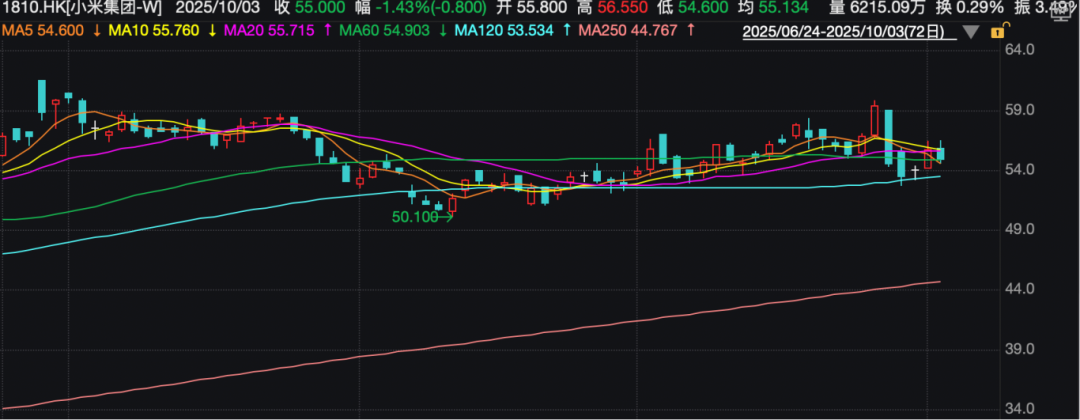 今日,港股整体走势疲软,小米集团股价收跌1.43%,报55港元/股,最新市值14315亿港元。