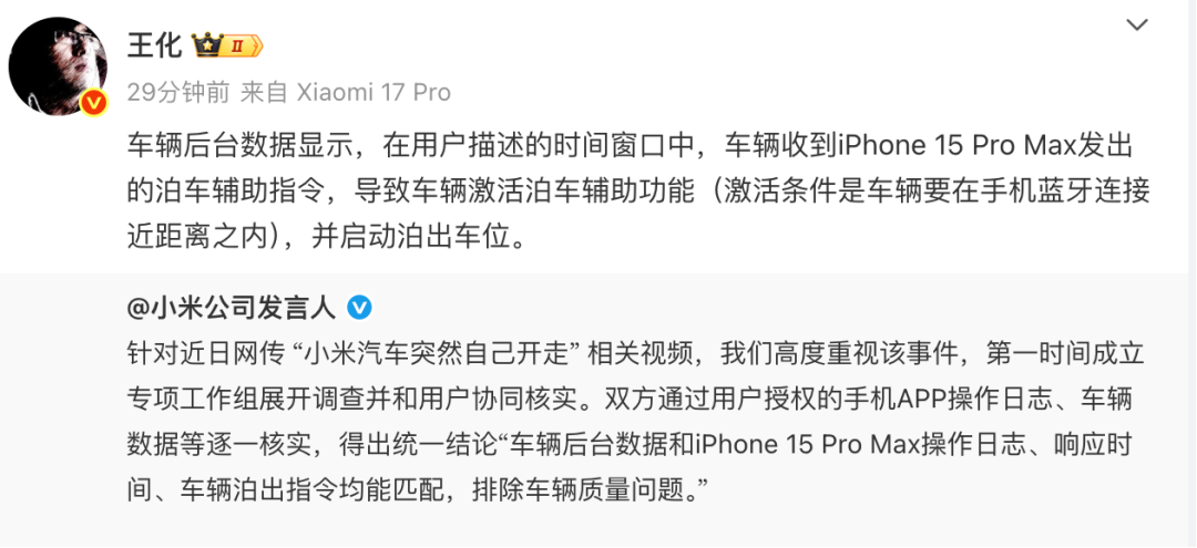 当天晚间,小米集团公关部总经理王化也转发相关微博,并强调:“车辆后台数据显示,在用户描述的时间窗口中,车辆收到iPhone 15 Pro Max发出的泊车辅助指令,导致车辆激活泊车辅助功能(激活条件是车辆要在手机蓝牙连接近距离之内),并启动泊出车位。”