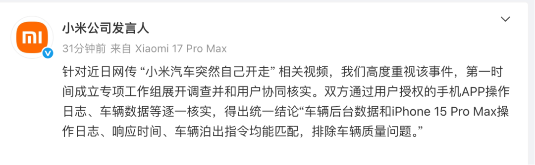10月3日晚间,针对近日网传 “小米汽车突然自己开走” 相关视频,小米公司发言人回应称,公司高度重视该事件,第一时间成立专项工作组展开调查并和用户协同核实。双方通过用户授权的手机APP操作日志、车辆数据等逐一核实,得出统一结论“车辆后台数据和iPhone 15 Pro Max操作日志、响应时间、车辆泊出指令均能匹配,排除车辆质量问题”。