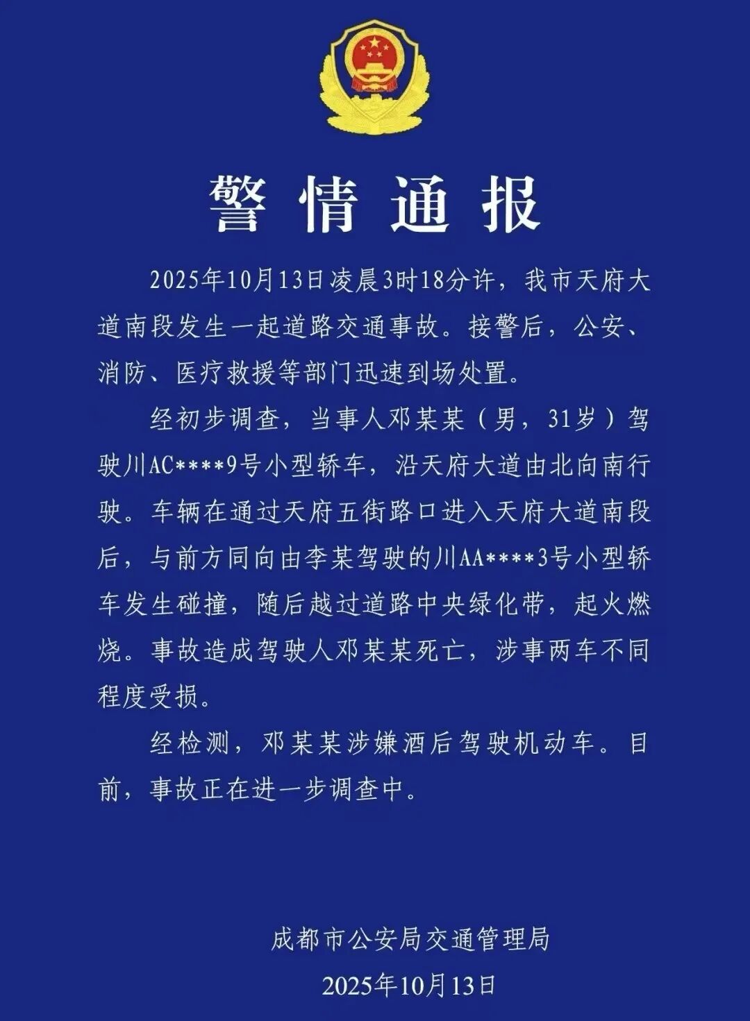 10月13日下午,成都市公安局交通管理局发布警情通报称,2025年10月13日凌晨3时18分许,成都市天府大道南段发生一起道路交通事故。接警后,公安、消防、医疗救援等部门迅速到场处置。
