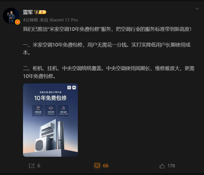 雷军:小米推出“米家空调10年免费包修”服务。