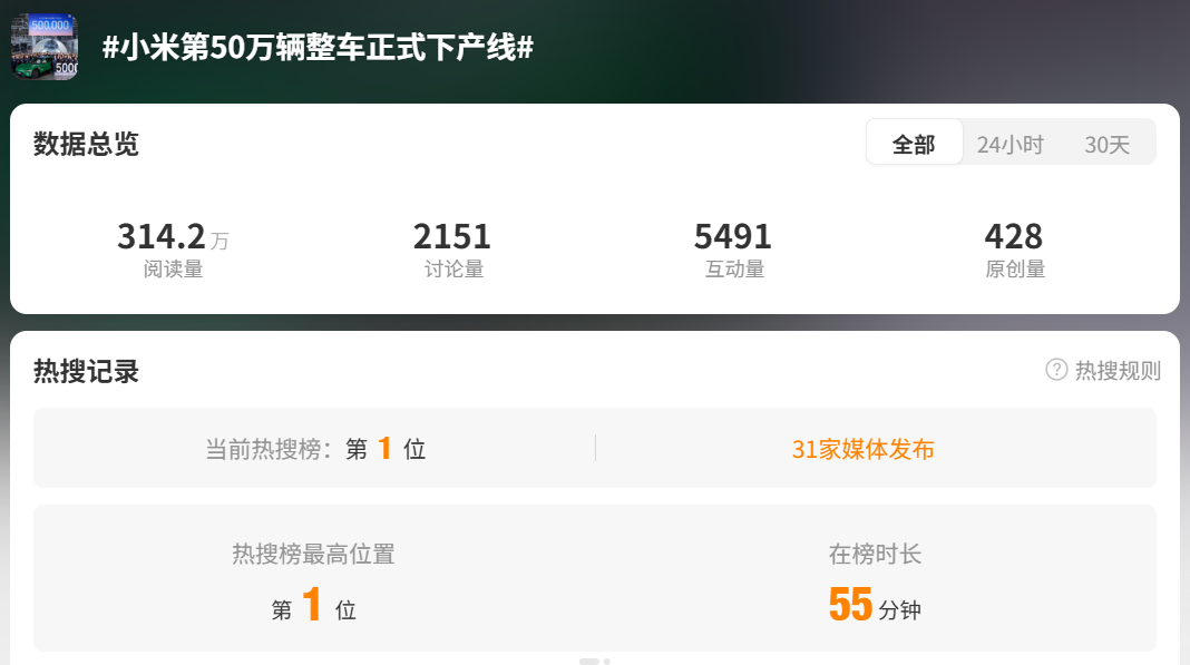11月20日,“小米第50万辆整车正式下产线”的词条迅速登上微博热搜榜首位,且关注度持续提升。