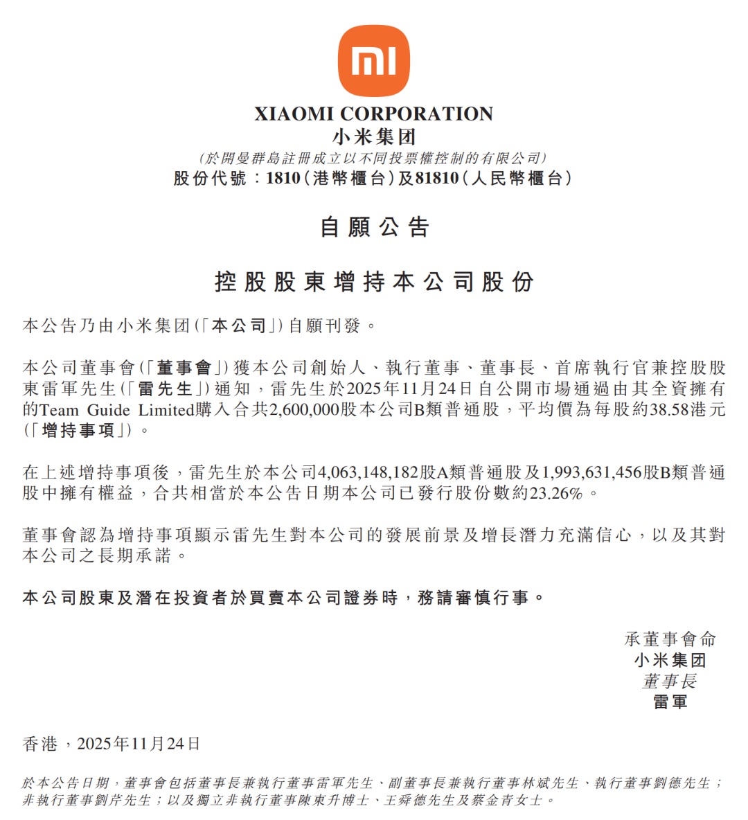 公告称,在上述增持事项后,雷军于本公司40.63亿股A类普通股及19.94亿股B类普通股中拥有权益,合共相当于本公告日期本公司已发行股份数约23.26%。
