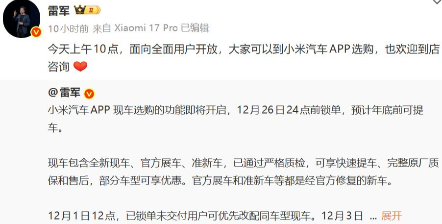 “今天(12月3日)上午10点,面向全面用户开放,大家可以到小米汽车App选购。”12月3日上午,小米集团董事长兼CEO雷军在其个人微博上宣布。