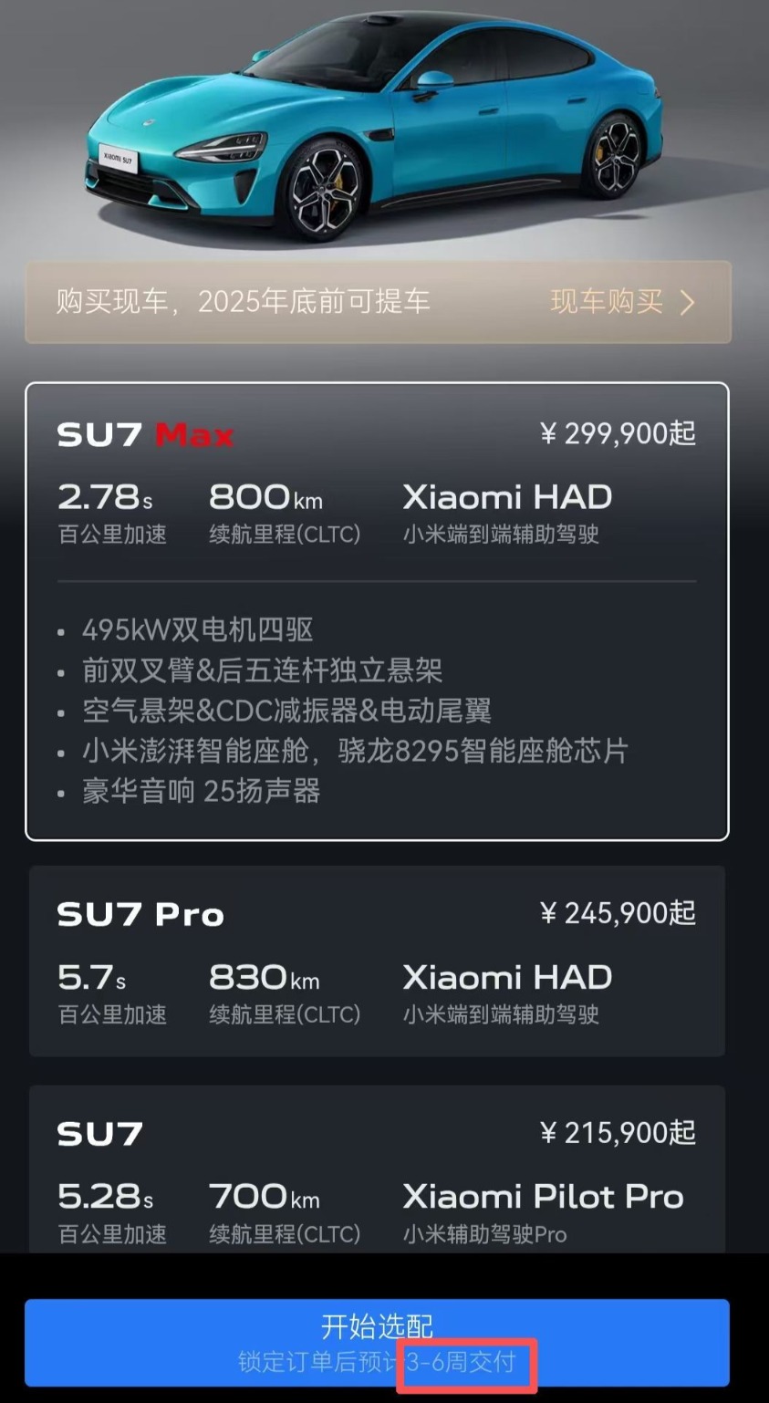 在开放“现车选购”的同时,小米汽车的新车交付周期也在缩短,最快仅需3至6周。
