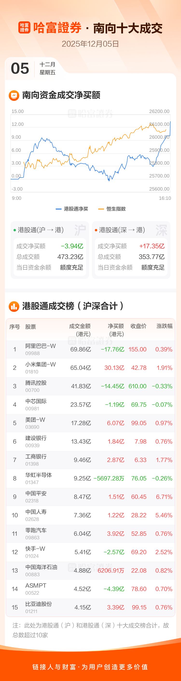 恒生指数12月5日涨0.58%,收报26085.08点。南向资金今日净买入港股13.41亿港元。南向资金今日成交额827.00亿港元,港股大市成交2104.73亿港元。